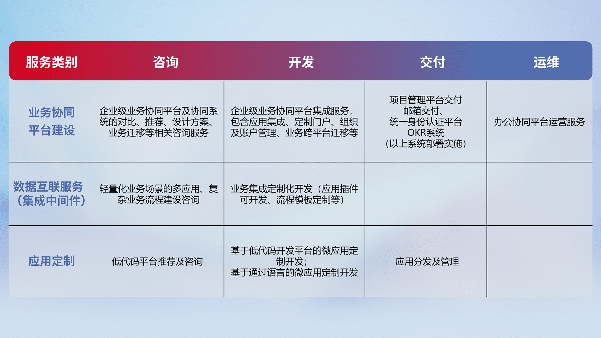 针对钉钉、、企微、、、、IDaas等平台级产品提供产品的规划、、方案、、、交付、、、定制化开发等服务,,实现如统一协同办公、、、、智能客户服务、、、、混合会议管理、、、、智能数据查询、、、、等业务场景,,,实现数字化转型。。。